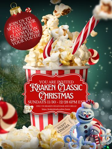 Step back into the wonder of childhood this holiday season at Kraken Heads Bar & Grille! Every Sunday night at 6 PM Eastern, from November 30th through December 28th, weβre screening the timeless claymation holiday classics we all grew up withβRudolph, Frosty, Santa, and more.